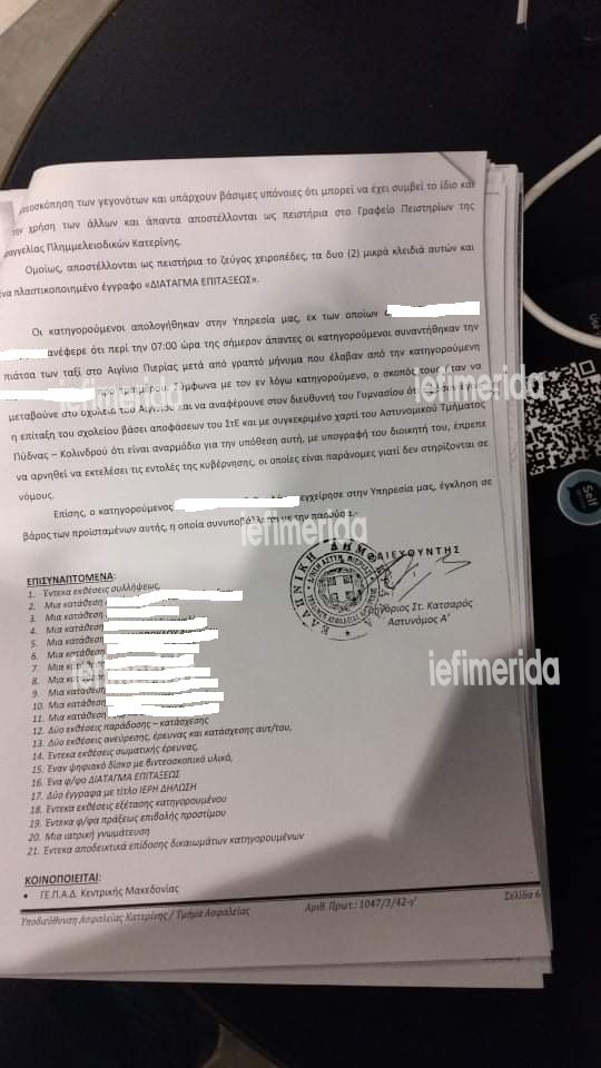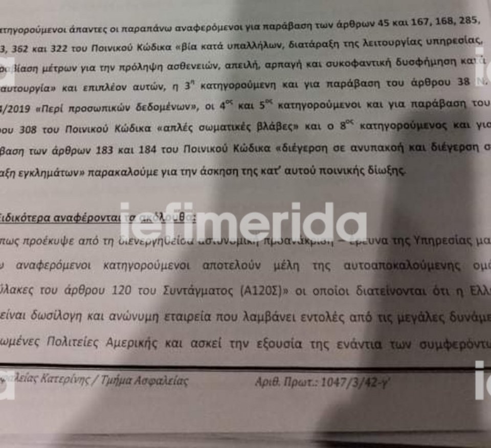 Στη δικογραφία επισημαίνεται ακόμη πως ένας από τους κατηγορούμενους κατά την απολογία του επισήμανε πως όλοι οι δράστες συναντήθηκαν πριν την επίθεση στην πιάτσα ταξί στο Αιγίνιο μετά από γραπτό μήνυμα που «έλαβαν από την… προ τριημέρου». «Σύμφωνα με τον εν λόγω κατηγορούμενο, ο σκοπός τους ήταν να μεταβούνε στο σχολείο του Αιγινίου και να αναφέρουν στον διευθυντή ότι εφόσον έγινε επίταξη του σχολείου βάσει αποφάσεων του ΣτΕ και με συγκεκριμένο χαρτί του Αστυνομικού τμήματος Πύδνας-Κολινδρού ότι είναι αναρμόδιο για την υπόθεση αυτή, με υπογραφή του διοικητή του, έπρεπε να αρνηθεί να εκτελέσει τις εντολές της κυβέρνησης, οι οποίες είναι παράνομες και δεν στηρίζονται σε νόμους. Επίσης, ο κατηγορούμενος… εγχείρησε στην υπηρεσίας μας, έγκληση σε βάρος των προϊσταμένων αυτής, η οποία συνυποβάλλεται με την παρούσα», σημειώνεται χαρακτηριστικά στα σχετικά έγγραφα.