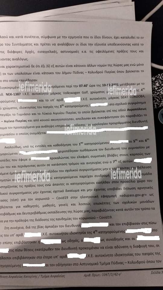 Οι αστυνομικοί της Υποδιεύθυνσης Ασφάλειας Κατερίνης έχουν καταγράψει λεπτομερώς και τη στιγμή της επίθεσης στον γυμνασιάρχη. «Οι αναφερόμενοι περί την 7:40 ώρα της 10/12/2021 μετέβησαν με το…. Αυτοκίνητο χρώματος μπλε και το αυτοκινητο ιδιοκτησίας… στο σχολικό συγκρότημα που στεγάζει το γυμνάσιο και το λύκειο Πιερίας, το οποίο βρίσκεται επί της οδού Ακροπόλεως- Αιγίνιο Πιερίας και από κοινού ακινητοποίησαν, απείλησαν και συκοφάντησαν ότι παραβιάζει το Σύνταγμα τον προσερχόμενο για ανάληψη υπηρεσίας εκτέλεσης του ωρολογίου προγράμματος διευθυντή γυμνασίου», τονίζεται στα σχετικά έγγραφα. «Ακολούθως υπό τις εντολές και καθοδήγηση του πρώτου κατηγορούμενου οι… χειροπέδησαν πισθάγκωνα τον διευθυντή του γυμνασίου προκαλώντας του ελαφρές σωματικές βλάβες στους καρπούς και περιάγοντάς τον σε κατάσταση τρόμου και ανησυχίας. Ο … παρέμενε έμπροσθεν της εισόδου- εξόδου του σχολικού συγκροτήματος μην επιτρέποντας την διέλευση μαθητών και καθηγητών. Οι δε λοιποί κατηγορούμενοι παρείχαν συνδρομή λειτουργώντας ως ομάδα, υποστηρίζοντας τις πράξεις τους, ενώ άπαντες οι κατηγορούμενοι εισήλθαν στον προαύλιο χώρο του σχολικού συγκροτήματος μην έχοντας σχετικό δικαίωμα και μην έχοντας υποβάλλει δήλωση αρνητικής κατάστασης για τον κορωνοϊό στην ηλεκτρονική πλατφόρμα», ανέφεραν χαρακτηριστικά οι αξιωματικοί της Ασφάλειας στο διαβιβαστικό που συνέταξαν προς τον Εισαγγελέα που χειρίζεται την υπόθεση.