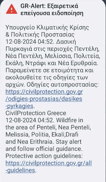 «Αν βρίσκεστε στη Νέα Πεντέλη απομακρυνθείτε προς Μελίσσια, και Παλαιά Πεντέλη απομακρυνθείτε προς Βριλήσσια», αναφέρει το μήνυμα.