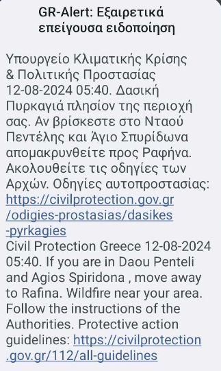 Νέο μήνυμα εστάλη από το 112, μέσω του οποίου καλούνται οι κάτοικοι των οικισμών Νταού Πεντέλης και Αγίου Σπυρίδωνα να απομακρυνθούν προς τη Ραφήνα.