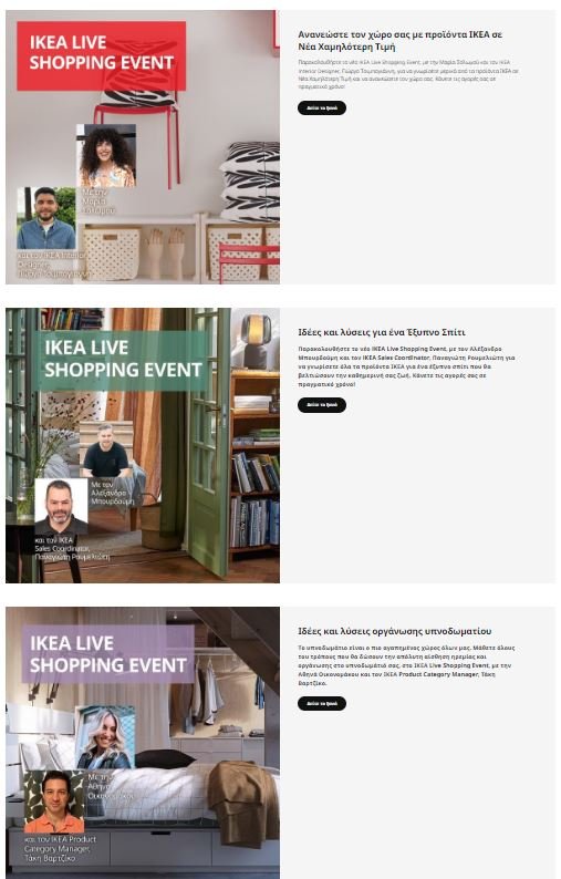 Τα ΙΚΕΑ Live Shopping Events προσφέρουν μια συναρπαστική εμπειρία αγορών, παρέχοντας χρήσιμα tips και λύσεις για όλους τους χώρους. Μέσα από αυτά τα events, οι καταναλωτές έχουν τη δυνατότητα όχι μόνο να εξοικειωθούν με τα προϊόντα, αλλά και να αγοράσουν απομακρυσμένα. Συνδυάζοντας την ψηφιακή τεχνολογία με τη δυνατότητα live συνομιλίας με τους hosts των events, η ΙΚΕΑ δημιουργεί μια διαδραστική εμπειρία αγορών.
