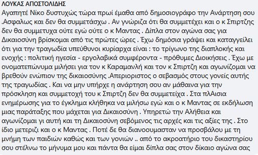 «Κύριοι ΛΟΥΚΑΣ ΑΠΟΣΤΟΛΙΔΗΣ και Θεόδωρος Μαντάς ακυρώστε γρήγορα αυτήν την παρωδία συζήτηση παρουσία του Χρήστου Σπίρτζη, ο οποίος για όλες τις οικογένειες είναι ένας από τους υπεύθυνους της δολοφονίας 57 αθώων ψυχών», έγραψε ο Νίκος Πλακιάς.