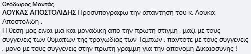 «Προσυπογράφω την απάντηση του κ. Λουκά Αποστολίδη. Η θέση μας είναι μία και μοναδική από την πρώτη στιγμή, μαζί με τους συγγενείς των θυμάτων της τραγωδίας των Τεμπών, πάντοτε με τους συγγενείς, μόνο με τους συγγενείς στην πρώτη γραμμή για την απονομή Δικαιοσύνης!».