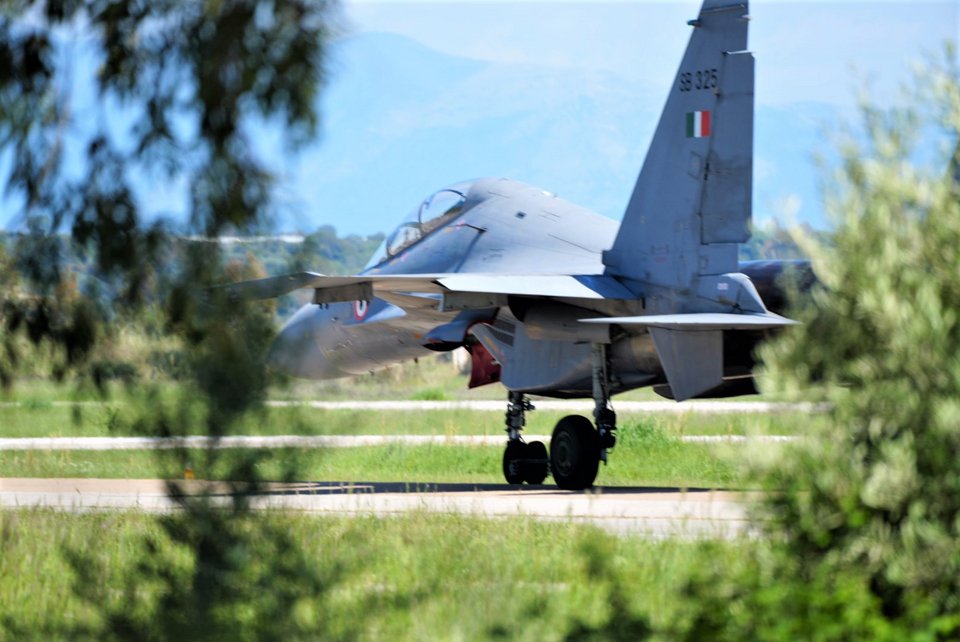 Λίγο παρακάτω και σε έτερο χώρο στην Αεροπορική Βάση Ανδραβίδας, στο σημείο της117 Πτέρυγα Μάχης (ΠΜ) όπου έχουν εγκατασταθεί τα τέσσερα γιγαντιαία, εξελιγμένα για την ινδική Πολεμική Αεροπορία Sukhoi 30 MKI, παρατηρούμε πως οι τεχνικοί έχουν μόλις κλείσει την καλύπτρα ενός ακόμη "Su", όπως αποκαλούν το βάρους 18,400 κιλών αεροσκάφος του Σχεδιαστικού Οίκου Sukhoi οι αεροπόροι των άλλων χωρών. Ξαφνικά κάτι σαν βροντή στα αυτιά. 'Ενας εκκωφαντικός ήχος συνδυάζεται με την εμφάνιση του τεράστιου ρύγχους του μαχητικού μέσα από τα φυλλώματα δέντρων που περιστοιχίζουν τα κτίρια της αποστολής της Indian Air Force και ένα μπλε φως εμφανίζεται στα ακροφύσια των κινητήρων την ώρα της απογείωσης του σπάνιου μαχητικού.