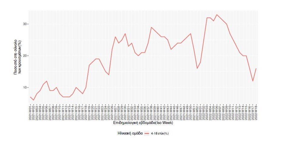 Ακολουθεί το διάγραμμα με το ποσοστό κρουσμάτων ατόμων ηλικίας 4-18 ετών στο σύνολο των κρουσμάτων COVID-19 ανά επιδημιολογική εβδομάδα αναφοράς: