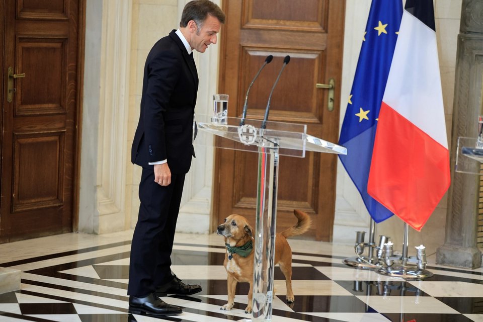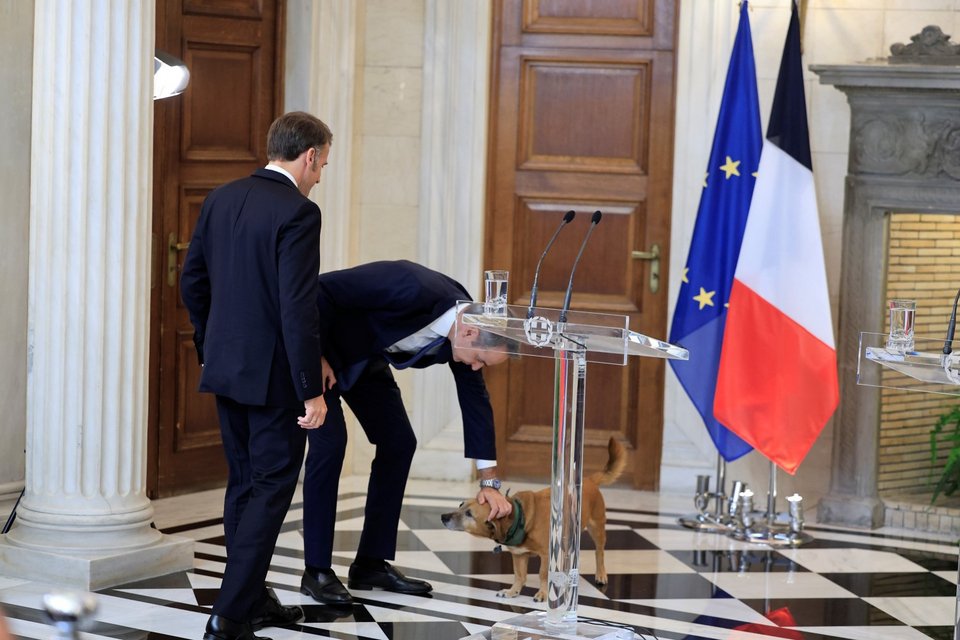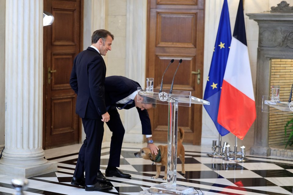 Μια χαλαρή στιγμή με τον Πίνατ, τον σκύλο του Μεγάρου Μαξίμου, είχε ο Εμανουέλ Μακρόν.
