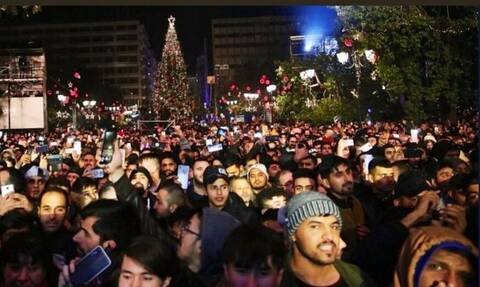 Οικογένειες αλλοδαπών, μανάδες με μαντίλες, παρέες νεαρών από την κεντρική Ασία (Πακιστάν, Αφγανιστάν κ.λπ.), για κάποιον άγνωστο λόγο συγκεντρώθηκαν στην Πλατεία Συντάγματος, μολονότι είχε ακυρωθεί η εκδήλωση για την παραμονή της Πρωτοχρονιάς.