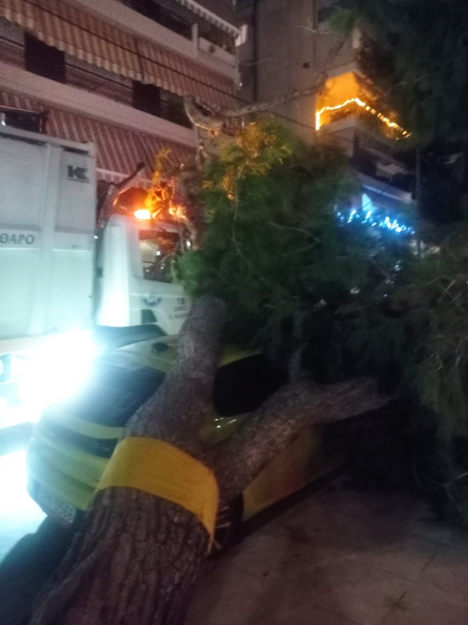 Ένα μεγάλο πεύκο ξεριζώθηκε και καταπλάκωσε απορριμματοφόρο και ένα αυτοκίνητο στο Παλαιό Φάληρο, το βράδυ της Κυριακής (4/1), στη συμβολή των οδών Βενιζέλου και 28ης Οκτωβρίου, στην περιοχή της Κοψαχείλας.