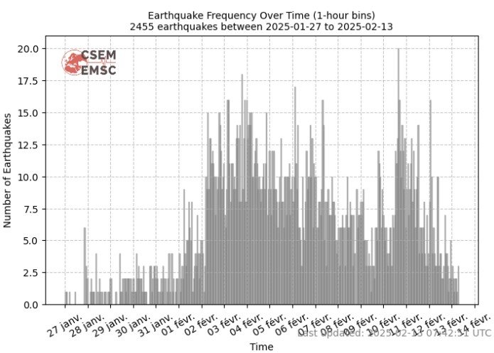 «Παρατηρείται σημαντική πτώση του πλήθους και των μεγεθών των σεισμών μετά τον τελευταίο ισχυρό σεισμό μεγέθους 5,0 στις 3:14 της 12/2. Κρίσιμο ερώτημα: πρόκειται για αποφόρτιση ή σχετική ησυχία που προετοιμάζει και άλλο ισχυρό σεισμό?», έγραψε ο κ. Παπαδόπουλος.