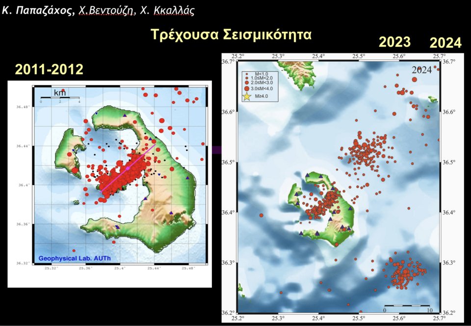 «Το 2023 δεν είχαμε πολλούς σεισμούς μέσα στην καλντέρα. Κάποιοι σεισμοί σημειώθηκαν μόνο βορειοανατολικά από την Σαντορίνη, την περιοχή του Κολόμβου που πάντα έχει μια μόνιμη ποιότητα και που στην περιοχή της Αναβύσσου επίσης υπάρχει κάποια δραστηριότητα. Όμως όπως θα δούμε στο επόμενο σχήμα, το 24, ξαφνικά είχαμε την γένεση κάποιων σεισμών πάλι στο κέντρο της Καλντέρας. Τον Σεπτέμβριο λοιπόν του 2024 ξεκίνησε μία ήπια σεισμική δραστηριότητα με πάρα πολύ μικρούς σεισμούς, οι οποίοι κάποιοι έκαναν αισθητή από τους κατοίκους και για αυτό ενημερώσαμε την πολιτεία».