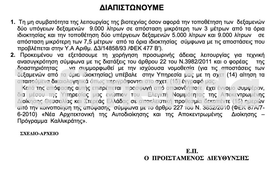 - Τη μη συμβατότητα της λειτουργίας της βιοτεχνίας όσον αφορά την τοποθέτηση των δεξαμενών δύο υπόγειων δεξαμενών 9.000 λίτρων σε απόσταση μικρότερη των 3 μέτρων από τα όρια ιδιοκτησίας και την τοποθέτηση δύο υπέργειων δεξαμενών 5.000 λίτρων και 9.000 λίτρων σε απόσταση μικρότερη των 7,5 μέτρων από τα όρια ιδιοκτησίας σύμφωνα με τις αποστάσεις που προβλέπεται στην Υ.Α Αριθμ. Δ3/14858/93 /ΦΕΚ 477 Β').
