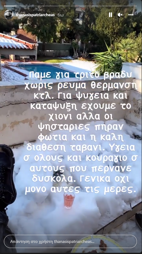 Ο Θανάσης Πατριαρχέας αναφέρει μέσα από τις αναρτήσεις στον προσωπικό του λογαριασμό στο Instagram πως έμεινε χωρίς ρεύμα και θέρμανση για τρία βράδια, γράφοντας μάλιστα πως «για ψυγεία και κατάψυξη έχουμε το χιόνι». Υγεία σε όλους εύχεται στη συνέχεια ο ηθοποιός, και κουράγιο σε όσους περνάνε δύσκολα, «γενικά, και όχι μόνο αυτές τις ημέρες». Παρά τις δύσκολες συνθήκες, «οι ψησταριές πήραν φωτιά και η καλή διάθεση ταβάνι» γράφει ο ηθοποιός με μια νότα αισιοδοξίας.