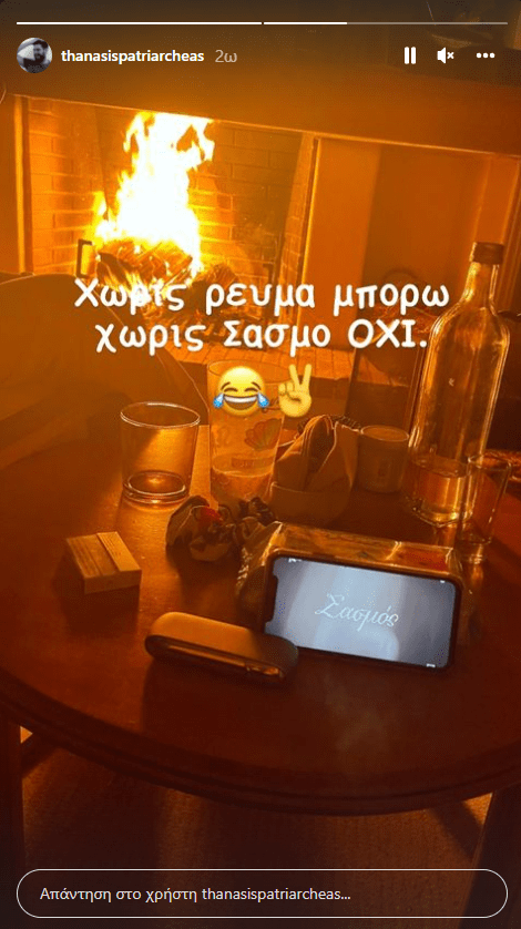 «Χωρίς ρεύμα μπορώ, χωρίς Σασμό όχι» γράφει σε ένα από τα stories του ο ηθοποιός, βλέποντας επεισόδιο της τηλεοπτικής σειράς μπροστά από τη φωτιά στο τζάκι, στην οθόνη του κινητού του, ενώ έχει εγκλωβιστεί από το χιόνι, όπως και χιλιάδες άλλοι πολίτες κατά τη διάρκεια της επέλασης της κακοκαιρίας «Ελπίδα».