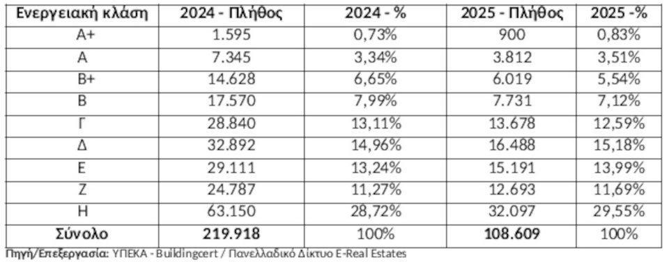 Την ίδια στιγμή, οι χαμηλότερες ενεργειακές κλάσεις Ε, Ζ και Η συγκέντρωσαν το 53,25% των κατοικιών το 2024 και το 55,23% το 2025, γεγονός που σημαίνει ότι περισσότερες από 5 στις 10 κατοικίες εντάχθηκαν στις ενεργειακά πιο επιβαρυμένες κατηγορίες. «Η διαπίστωση αυτή συνδέεται άμεσα με συνθήκες αυξημένου κόστους λειτουργίας και ενεργειακής φτώχειας για μεγάλο μέρος των νοικοκυριών», αναφέρει ο πρόεδρος του Πανελλαδικού Κτηματομεσιτικού Δικτύου E- Real Estates, Θεμιστοκλής Μπάκας.