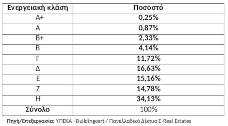 Όπως προκύπτει, οι υψηλές ενεργειακές κατηγορίες Α+ έως Β συγκέντρωσαν εξαιρετικά περιορισμένο ποσοστό του συνολικού οικιστικού αποθέματος. Το εύρημα αυτό επιβεβαίωσε τη χαμηλή διείσδυση σύγχρονων, ενεργειακά αποδοτικών κατοικιών στην Ελλάδα και ανέδειξε το διαρθρωτικό έλλειμμα ανανέωσης και αναβάθμισης του κτιριακού αποθέματος. Αντιθέτως, η συντριπτική πλειονότητα των κατοικιών εντάχθηκε στις χαμηλότερες ενεργειακές κλάσεις, με την κατηγορία Η να καταγράφει το υψηλότερο ποσοστό (34,13%), ενώ ακολουθούν οι κλάσεις Δ (16,63%), Ε (15,16%) και Ζ (14,78%).