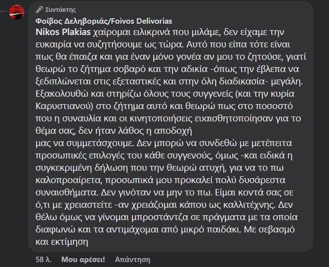 Ο Νίκος Πλακιάς, πατέρας των δίδιμων κοριτσιών που έχασαν τη ζωή τους στα Τέμπη, απαντώντας κάτω από την ανάρτηση του Φοίβου Δεληβοριά -με την οποία καταδικάζει την άποψη Καρυστιανού για τις αμβλώσεις- μιλά για ευθύνες των καλλιτεχνών που συμμετείχαν στη συναυλία στο Καλλιμάρμαρο, κάνοντας λόγο για «εμπόδια» που γεννήθηκαν μετά από αυτό το γεγονός.