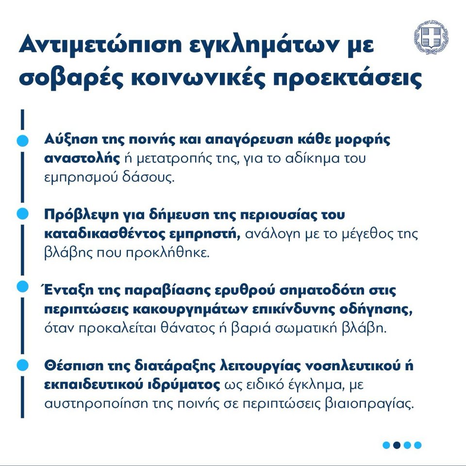 Πρόσθεσε ακόμη ότι «στο σχέδιο νόμου περιλαμβάνονται ρυθμίσεις, που αντιμετωπίζουν κρίσιμα θέματα αυξημένου εθνικού και κοινωνικού ενδιαφέροντος, όπως η οικολογική καταστροφή μέσω των εμπρησμών, η ενδοοικογενειακή βία, η προστασία αλλά και η παραβατικότητα των ανηλίκων. Ενδεικτικά: