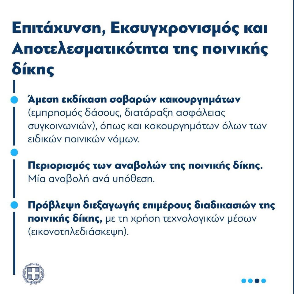 Δεύτερον, στην επιτάχυνση των διαδικασιών και του χρόνου της ποινικής δίκης, που αποτελεί μέρος του γενικότερου σχεδίου για ταχύτερη απονομή του δικαίου στη χώρα μας. Επίσης ανέφερε χαρακτηριστικά παραδείγματα.