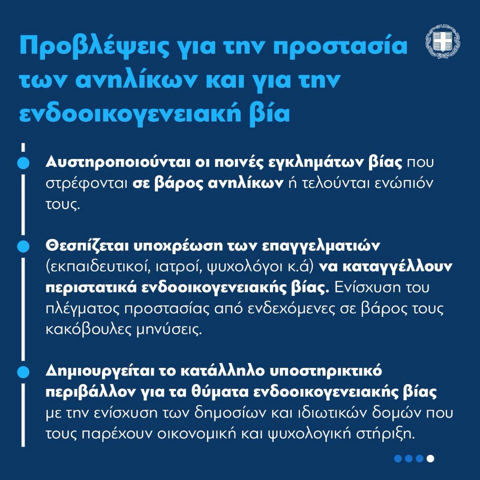 - Θεσπίζεται υποχρέωση των επαγγελματιών (εκπαιδευτικοί, ιατροί, ψυχολόγοι κ.ά.) να καταγγέλλουν περιστατικά ενδοοικογενειακής βίας, με ταυτόχρονη ενίσχυση του πλέγματος προστασίας, από ενδεχόμενες σε βάρος τους κακόβουλες μηνύσεις.