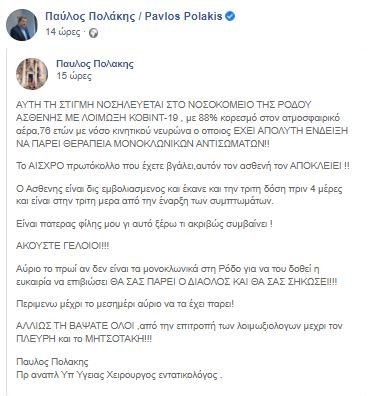 Ο Παύλος Πολάκης με ανάρτησή του στο Facebook ζητάει να χορηγηθούν μονοκλωνικά αντισώματα σε ασθενή με κορωνοϊό που νοσηλεύεται στο νοσοκομείο της Ρόδου.