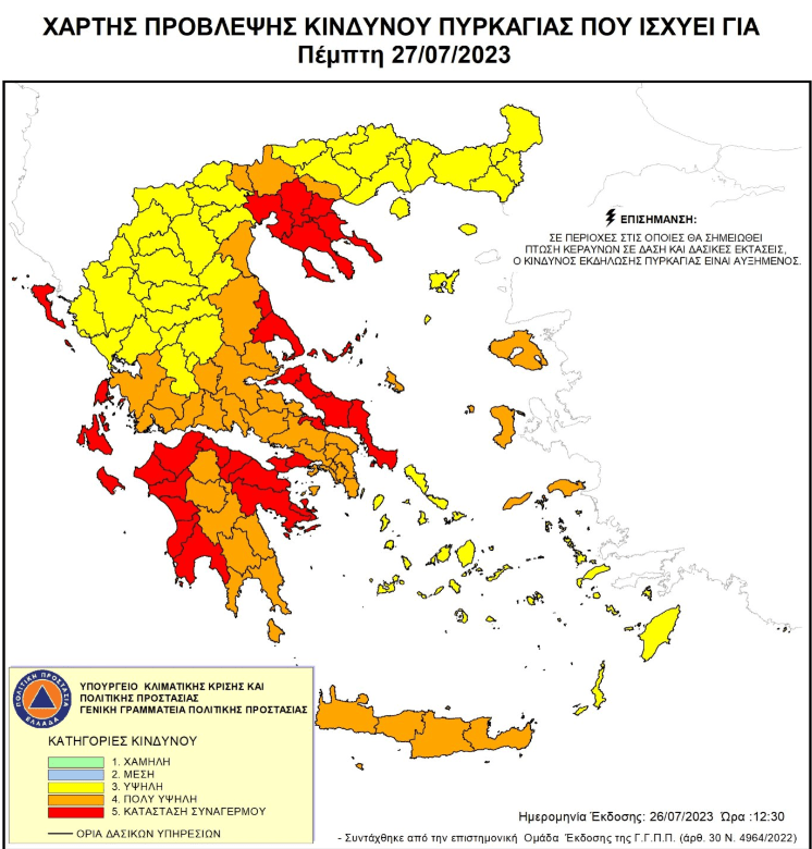 Ακραίος κίνδυνος πυρκαγιάς - Κατάσταση Συναγερμού (κατηγορία κινδύνου 5) για τις εξής περιοχές: