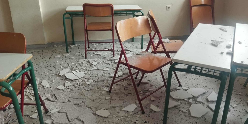 Σύμφωνα με την καταγγελία του Συλλόγου Εκπαιδευτικών Π.Ε. «Κώστας Σωτηρίου», ξαφνικά αποκολλήθηκε μεγάλο κομμάτι σοβά του ταβανιού σχολικής αίθουσας.