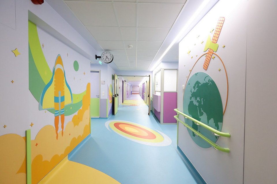 Επιπλέον, πολύχρωμες ζωγραφιές και χαρούμενα μοτίβα στους τοίχους και στα δάπεδα δημιουργούν ένα ευχάριστο περιβάλλον για τα παιδιά.