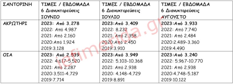 Στην Οία στης Σαντορίνης, οι προ-κρατήσεις για βίλες με ιδιωτική πισίνα κατάλληλες για 4 έως 6 επισκέπτες για τον μήνα Ιούνιο αγγίζει το 99%, τον μήνα Ιούλιο το 96% και τον Αύγουστο το 94%. Τον Ιούνιο το κόστος μίσθωσης για 6 διανυκτερεύσεις σε κατοικία 72 τ.μ. ξεκινά από 2.539 , τον Ιούλιο από 3.949€ και τον Αύγουστο από 3.240€.
