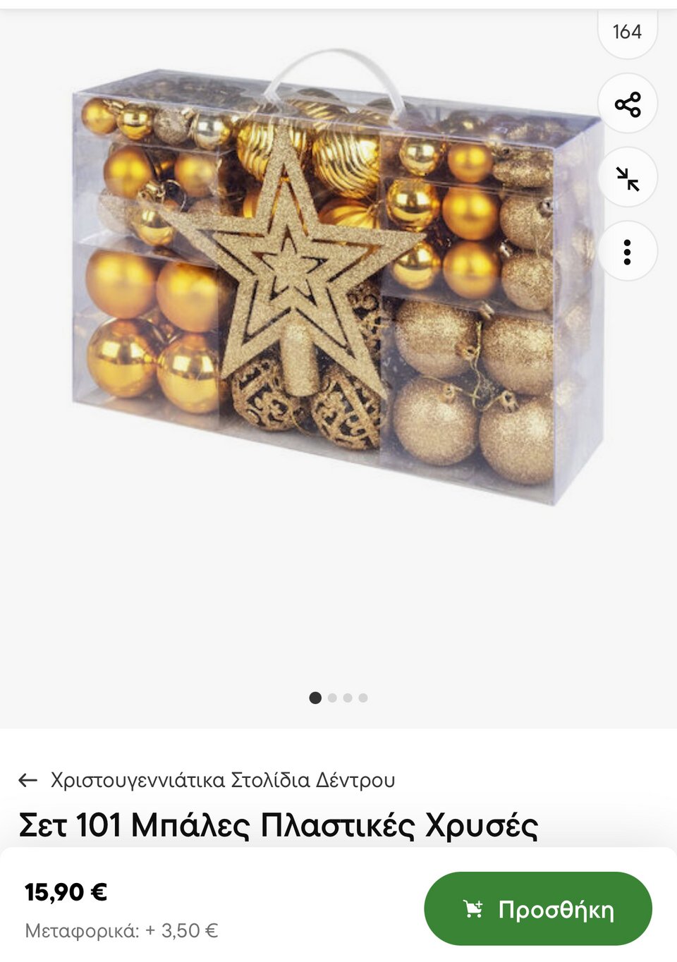 Όσον αφορά τις χριστουγεννιάτικες μπάλες, ένα σετ των 100 πλαστικών, στοιχίζει 15 ευρώ. Οι τιμές αυξάνονται ανάλογα με το υλικό, για παράδειγμα οι γυάλινες είναι ακριβότερες. Το τελευταίο στολίδι που τοποθετούμε στην κορυφή του δέντρου, το αστέρι, ξεκινάει από 15 ευρώ.