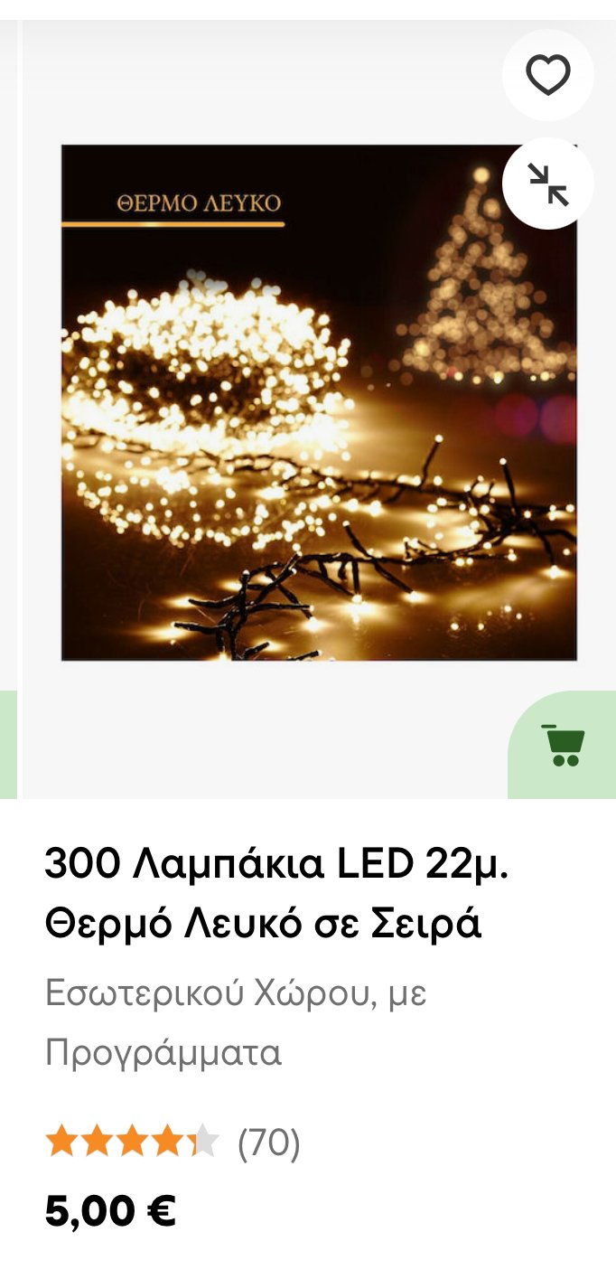 Τα Χριστουγεννιάτικα λαμπάκια εσωτερικού και εξωτερικού χώρου επίσης η τελική τους τιμή καθορίζεται από τα μέτρα και την ποιότητα. Βέβαια υπάρχουν και προσφορές για τα κλασικά λαμπάκια (θερμό λευκό στην σειρά) με 5 ευρώ.