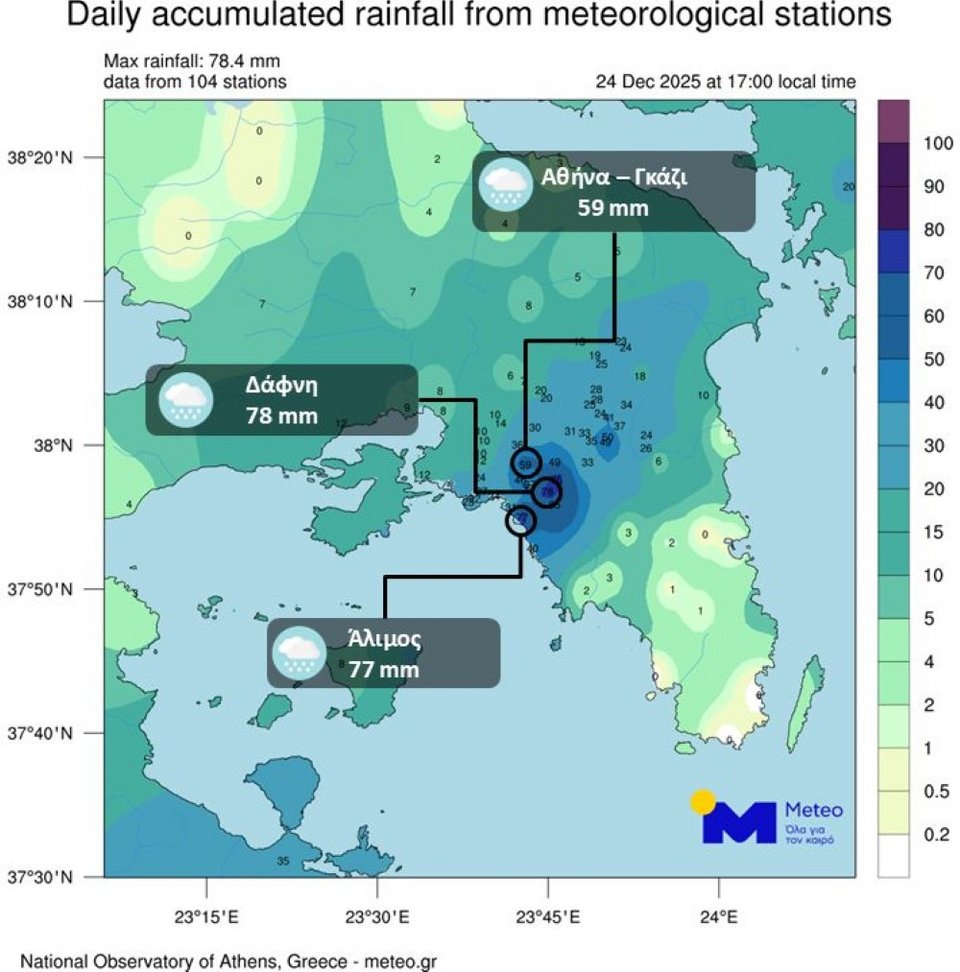 Συγκεκριμένα, στην περιοχή της Αττικής, σύμφωνα με το Μετεωρολογικό και Κλιματικό Παρατηρητήριο Αττικής του Εθνικού Αστεροσκοπείου Αθηνών / Meteo.gr, με εξαίρεση τα νότια τμήματα της Αττικής, στην υπόλοιπη Αττική σημειώθηκαν σημαντικά ύψη βροχής, όπως ευδιάκριτα αποτυπώνεται σε σχετικό χάρτη. Ειδικότερα στο Γκάζι καταγράφηκαν 59mm βροχής.