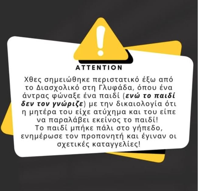 Μόλις το περιστατικό έγινε γνωστό την επόμενη ημέρα, οι σύλλογοι γονέων στα σχολεία της Γλυφάδας σε συνεργασία με την Ένωση Συλλόγων Γονέων Γλυφάδας κινητοποιήθηκαν αμέσως προκειμένου να ενημερώσουν τα παιδιά αλλά και να συστήσουν ψυχραιμία. Αυτή ήταν μία από τις ανακοινώσεις που έφτασε στα κινητά των γονέων της Γλυφάδας: