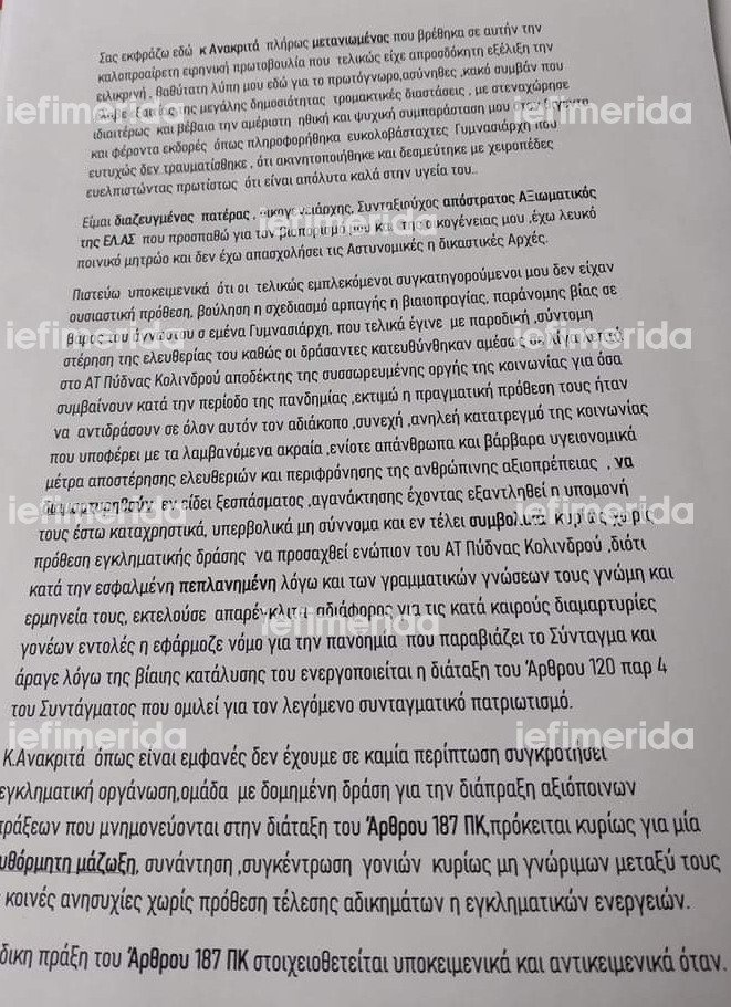 «Είμαι διαζευγμένος πατέρας, οικογενειάρχης, συνταξιούχος απόστρατος αξιωματικός της ΕΛΑΣ που προσπαθώ για τον βιοπορισμό μου και της οικογένειάς μου, έχω λευκό ποινικό μητρώο και δεν έχω απασχολήσει τις αστυνομικές ή δικαστικές αρχές. Πιστεύω υποκειμενικά ότι οι τελικώς εμπλεκόμενοι συγκατηγορούμενοι μου δεν είχαν ουσιαστική πρόθεση, βούληση ή σχεδιασμό αρπαγής ή βιαιοπραγίας παράνομης βίας σε βάρος του άγνωστου σε εμένα Γυμνασιάρχη, που τελικά έγινε με παροδική, σύντομη στέρηση της ελευθερίας του, καθώς οι δράσαντες κατευθύνθηκαν αμέσως σε λίγα λεπτά στο ΑΤ Πύδνου Κολινδρού, αποδέκτης της συσσωρευμένης οργής για τα όσα συμβαίνουν κατά την περίοδο της πανδημίας», είπε ενώπιον του ανακριτή και συνέχισε: «Εκτιμώ η πραγματική τους πρόθεση ήταν να αντιδράσουν σε όλον αυτόν τον αδιάκοπο, συνεχή, ανηλεή κατατρεγμό της κοινωνίας που υποφέρει με τα λαμβανόμενα ακραία, ενίοτε απάνθρωπα και βάρβαρα υγειονομικά μέτρα αποστέρησης ελευθεριών και περιφρόνησης της ανθρώπινης αξιοπρέπειας».