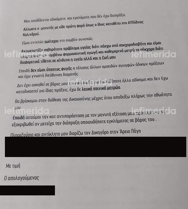 Σύμφωνα με αποκλειστικές πληροφορίες του iefimerida.gr, το πρώην μέλος του κόμματος του Ηλία Κασιδιάρη που συνελήφθη για την «αρπαγή» του γυμνασιάρχη από σχολείο της Πιερίας στο απολογητικό του υπόμνημα υποστηρίζει πως του αποδίδονται αδικήματα και εγκλήματα που δεν έχει διαπράξει. «Ο μηνυτής με είδε πρώτη φορά όπως ο ίδιος καταθέσει στο ΑΤ. Είμαι εντελώς αμέτοχος στο συμβάν συνεπώς. Αντιμετωπίζω προβλήματα υγείας, διότι πάσχω από σακχαροδιαβήτη και είμαι υπερτασικός και λαμβάνω φαρμακευτική αγωγή και καθημερινά μετρώ το σάκχαρο διότι διαφορετικά τίθεται σε κίνδυνο η υγεία και η ζωή μου», ανέφερε.
