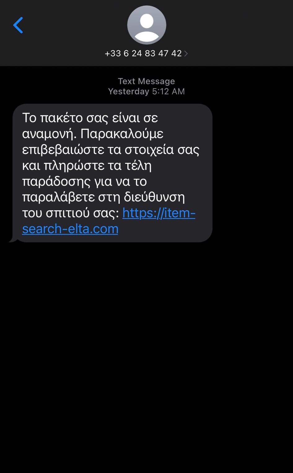 «Το πακέτο σας είναι σε αναμονή. Παρακαλούμε επιβεβαιώστε τα στοιχεία και πληρώστε τα τέλη παράδοσης για να το παραλάβετε στη διεύθυνση του σπιτιού σας», αναφέρεται χαρακτηριστικά στο μήνυμα-απάτη.