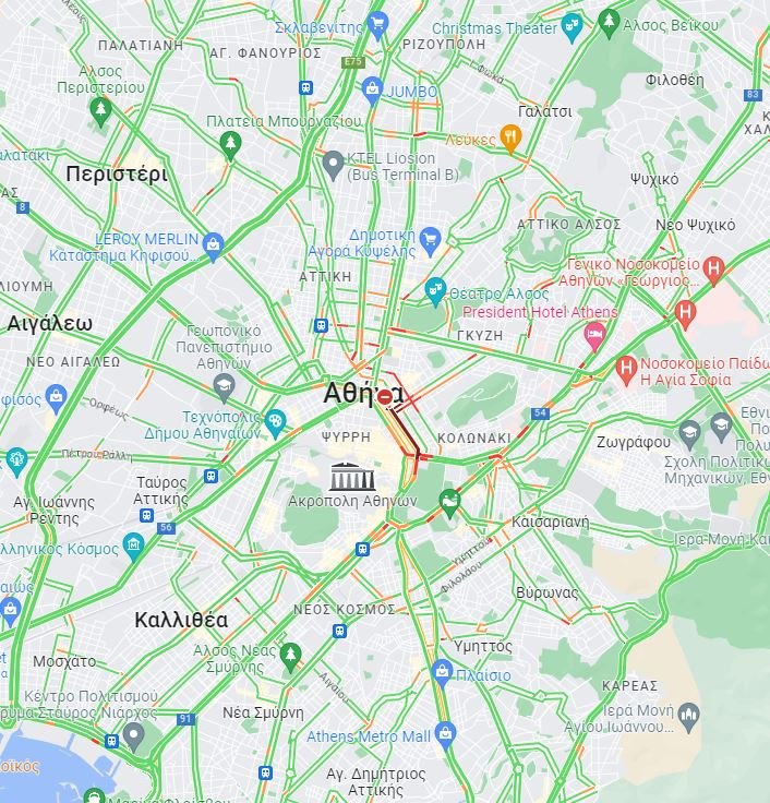 Η κίνηση στο κέντρο της Αθήνας είναι αυξημένη, στους δρόμους γύρω από την Πανεπιστημίου.
