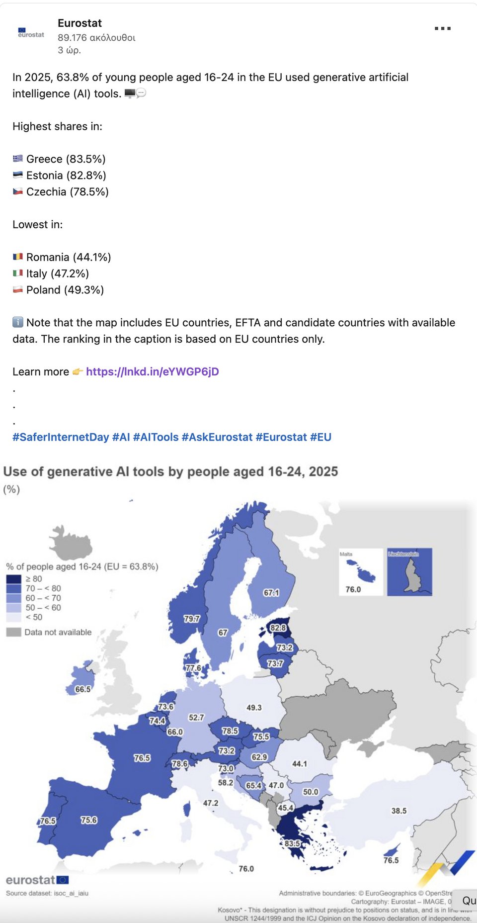 Σύμφωνα λοιπόν με τα επίσημα στοιχεία το ποσοστό των νέων στην Ελλάδα που χρησιμοποιούν την Τεχνητή Νοημοσύνη είναι 83,5 %, ακολουθούν αυτοί της Εσθονίας με 82,8 % και στην τρίτη θέση η Τσεχία με 78,5 %.