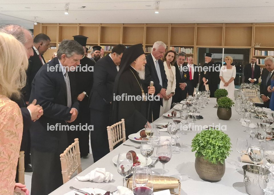 Όταν η δίωρη δεξίωση ολοκληρώθηκε και οι κήποι άδειασαν, o Οικουμενικός Πατριάρχης και ο πρέσβης κατευθύνθηκαν προς στο Κέντρο Πολιτισμού Ίδρυμα Σταύρος Νιάρχος, όπου παρατέθηκε και δείπνο προς τιμήν του κ. Βαρθολομαίου στο εντυπωσιακό Lighthouse τού 8ου ορόφου, σε στενότερο κύκλο.