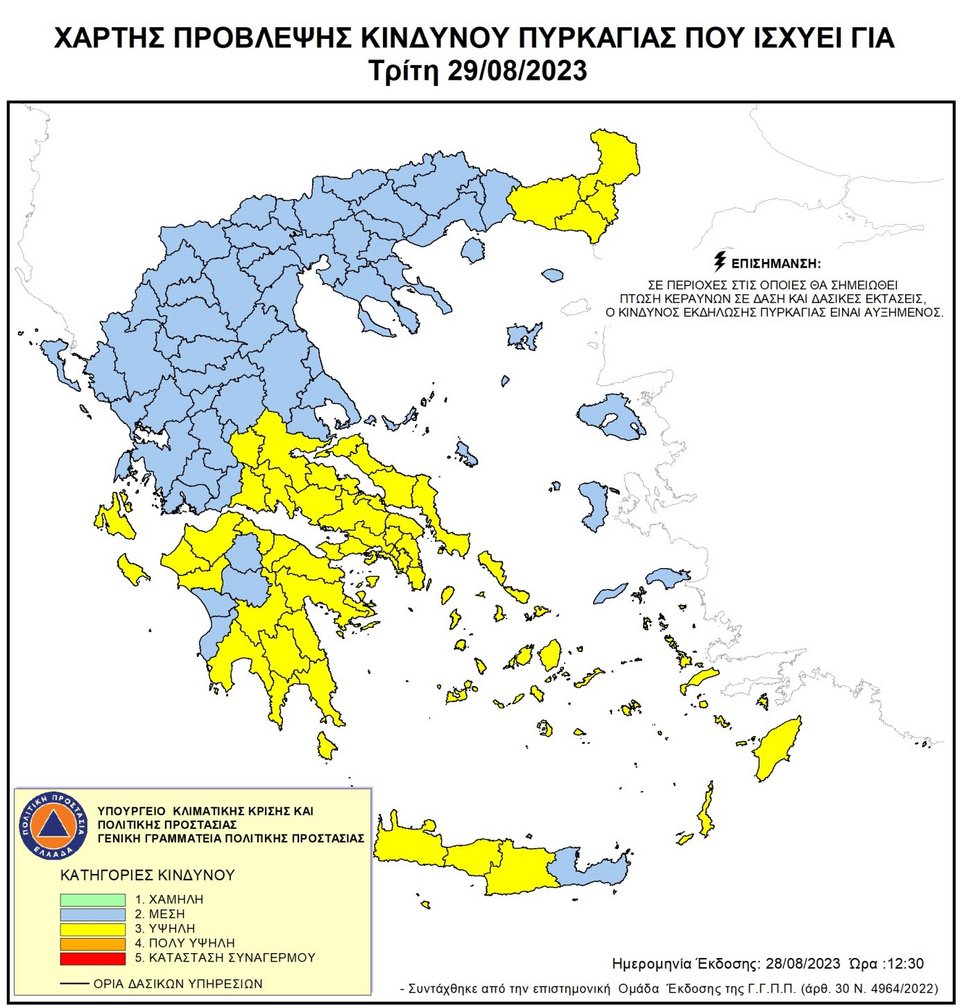 Για αύριο Τρίτη παραμένει υψηλός ο κίνδυνος πυρκαγιάς σε πολλές περιοχές της χώρας. Σε γενική επιφυλακή παραμένει το προσωπικό των Πυροσβεστικών Υπηρεσιών της επικράτειας προκειμένου να αντιμετωπιστούν οι αυξημένες υπηρεσιακές απαιτήσεις, που έχουν προκύψει λόγω του μεγάλου αριθμού πυρκαγιών, ενώ συνεχίζονται οι περιπολίες εναέριας επιτήρησης, καθώς και περιπολίες από πυροσβεστικές, αστυνομικές και στρατιωτικές δυνάμεις.
