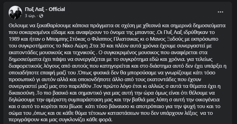 «Θελουμε να ξεκαθαρίσουμε κάποια πράγματα σε σχέση με χθεσινά και σημερινά δημοσιεύματα που σοκαρισμένοι είδαμε και αναφέρουν το όνομα της μπάντας. Οι Πυξ Λαξ ιδρύθηκαν το 1989 και ήταν ο Μπάμπης Στόκας, ο Φίλιππος Πλιάτσικας και ο Μάνος Ξυδούς με εκπρόσωπο του συγκροτήματος το Νίκο Λώρη. Στα 30 και πλέον αυτά χρόνια έχουμε συνεργαστεί με εκατοντάδες μουσικούς και τεχνικούς. Ο συγκεκριμένος μουσικός που αναφέρεται στα δημοσιεύματα έχει πάψει να συνεργάζεται με το συγκρότημα εδώ και χρόνια, για τελείως διαφορετικούς λόγους από αυτούς που κατηγορείται, και στο διάστημα αυτό δεν έχει υπάρξει η οποιαδήποτε επαφή μαζί του.