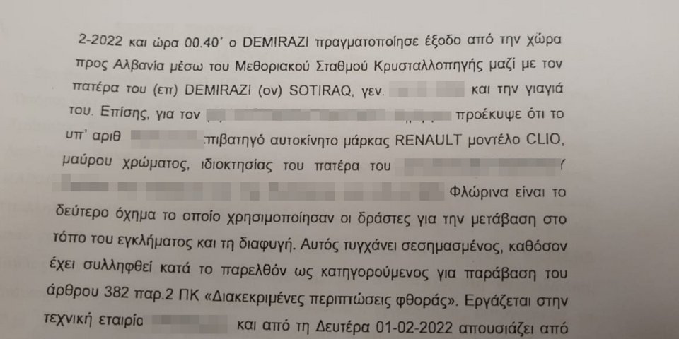 Όπως αποκαλύπτει το iefimerida.gr, ο Αλβανός κατάφερε να διαφύγει στις 00:40 μετά τα μεσάνυχτα της 2 Φεβρουαρίου, δηλαδή 24 ώρες μετά το έγκλημα, από τον μεθοριακό σταθμό της Κρυσταλλοπηγής, με αυτοκίνητο στο οποίο επέβαιναν επίσης ο πατέρας του και η γιαγιά του.
