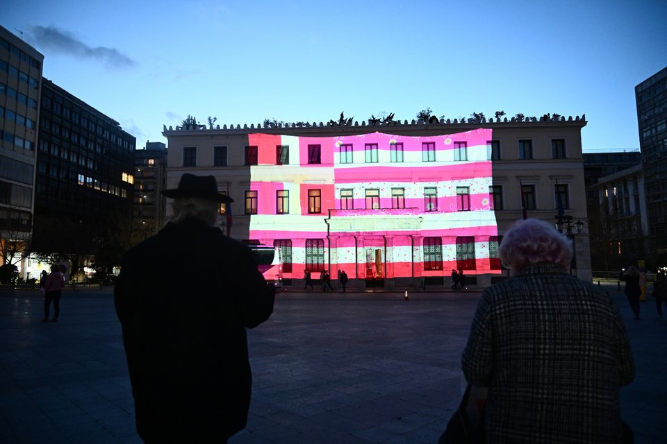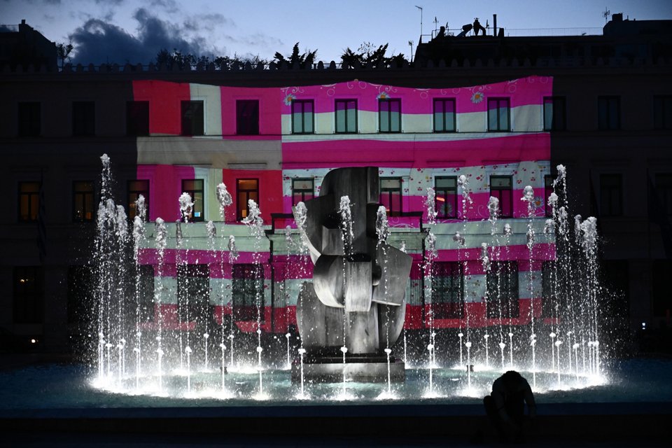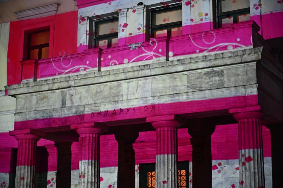 Με αφορμή την Παγκόσμια Ημέρα της Γυναίκας, η πρόσοψη του Δημαρχείου της Αθήνας «ντύθηκε» με τη ροζ σημαία της Γεωργίας Λαλέ.
