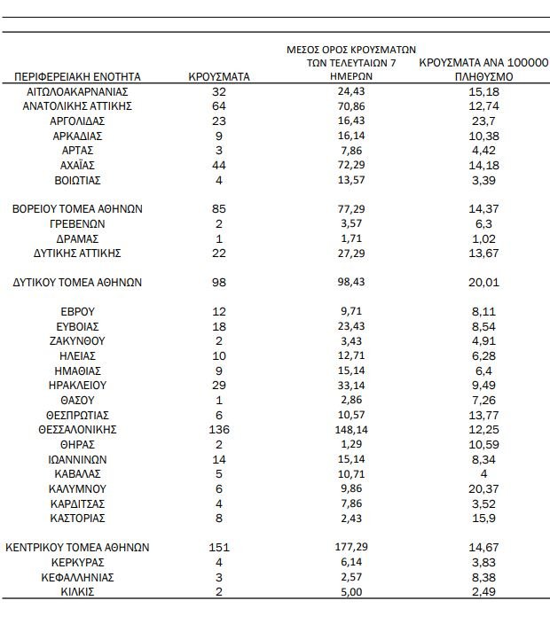 Όσον αφορά την Περιφερειακή Ενότητα Αττικής τα περισσότερα κρούσματα εντοπίζονται στο κέντρο, με 151 μολύνσεις, ενώ ακολουθεί ο δυτικός τομέας Αθηνών με 98 νέα κρούσματα και ο βόρειος τομέας με 85.