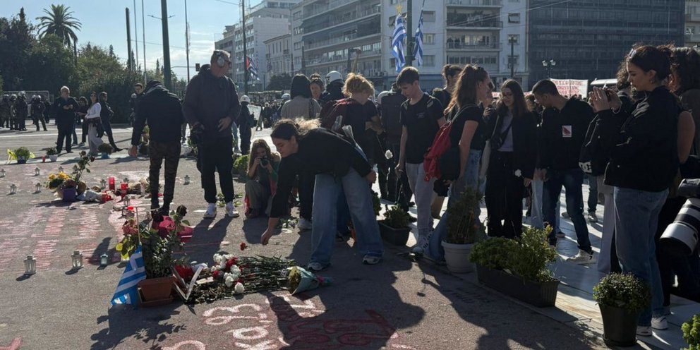 Αντιπροσωπεία μαθητών κατέθεσε λουλούδια στη σημείο που έχουν γραφτεί τα ονόματα των 57 νεκρών στο δυστύχημα των Τεμπων, με τους αστυνομικούς να ανοίγουν διάδρομο για να μην προκληθούν επεισόδια.