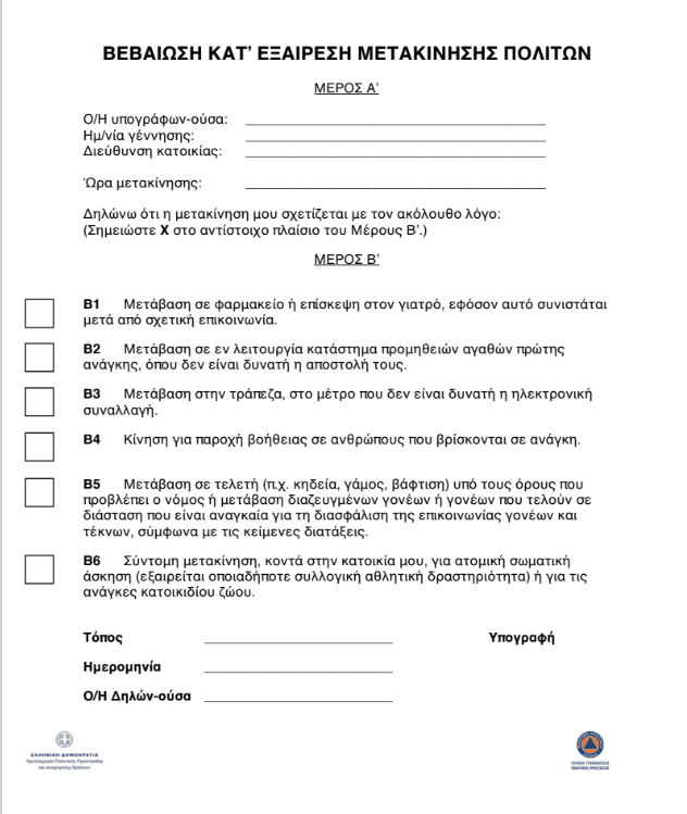 Στην φόρμα που συμπληρώνει με δική του ευθύνη και την υπογράφει, δίνει το ονοματεπώνυμό του, την διεύθυνσή του, την ημερομηνία γέννησης, την ώρα που θα βγει και τσεκάρει με ένα Χ το ένα από τα έξι κουτιά, όπου δίπλα αναφέρονται οι λόγοι του αιτήματος μετακίνησής του. Στο κάτω μέρος υπογράφει με την ημερομηνία που κάνει το αίτημα.