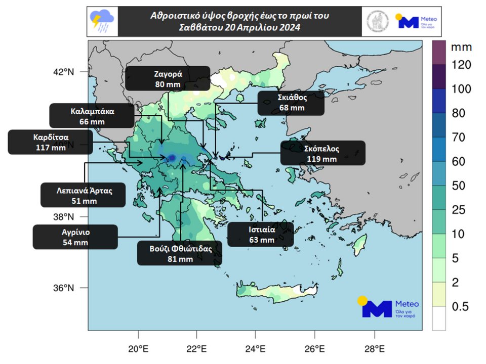 Το μέγιστο ύψος βροχής έως σήμερα καταγράφηκε στη Γλώσσα Σκοπέλου (119 χιλιοστά) και ακολούθησε η πόλη της Καρδίτσας (117 χιλιοστά).