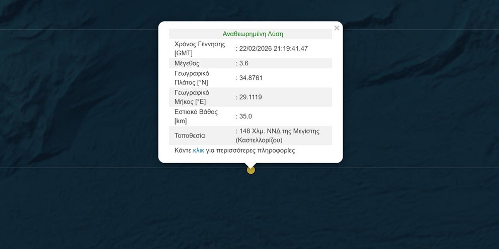 Σύμφωνα με την Αναθεωρημένη Λύση του Γεωδυναμικού Ινστιτούτου Αθηνών το επίκεντρο του σεισμού εντοπίστηκε 145 χιλιόμετρα ΝΝΔ της Μεγίστης Καστελόριζου και είχε εστιακό βάθος 35Χλμ.
