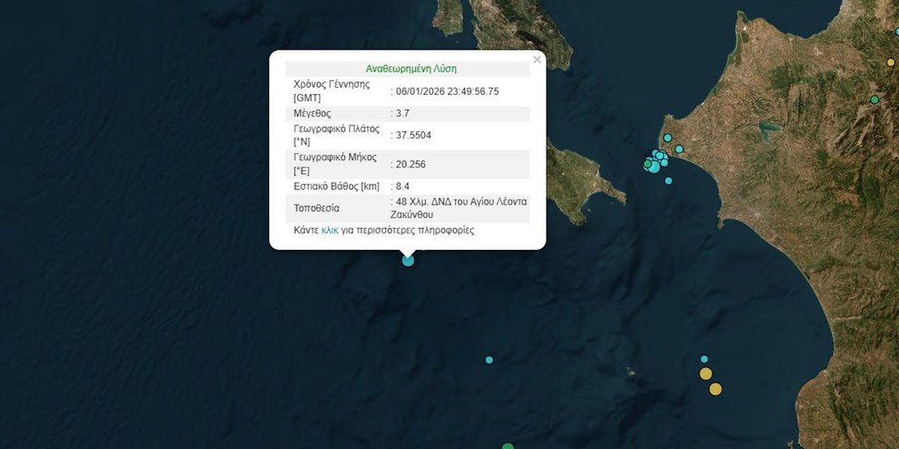 Σεισμική δόνηση 3,7 Ρίχτερ σημειώθηκε στη 01:50 σε υποθαλάσσια περιοχή του Ιονίου Πελάγους, δυτικά της Ζακύνθου.