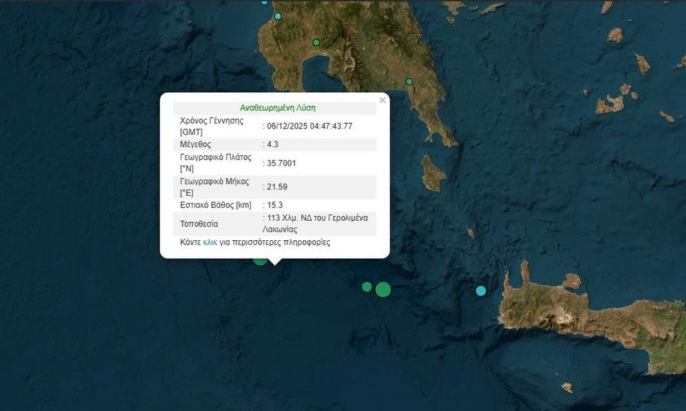 Ο σεισμός έγινε 113 χλμ Νοτιοδυτικά του Γερολιμένα Λακωνίας και σε εστιακό βάθος 15,3 χιλιομέτρων, σύμφωνα με εκτίμηση του Γεωδυναμικού Ινστιτούτου του Εθνικού Αστεροσκοπείου Αθηνών.