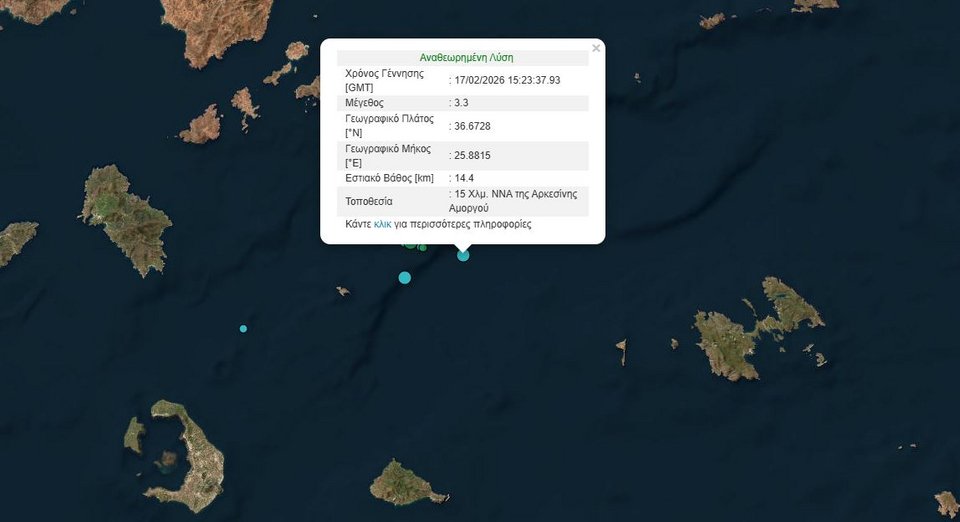 Σεισμός μεγέθους 3,3 Ρίχτερ σημειώθηκε το απόγευμα της Τρίτης (17/2) κοντά στην Αμοργό